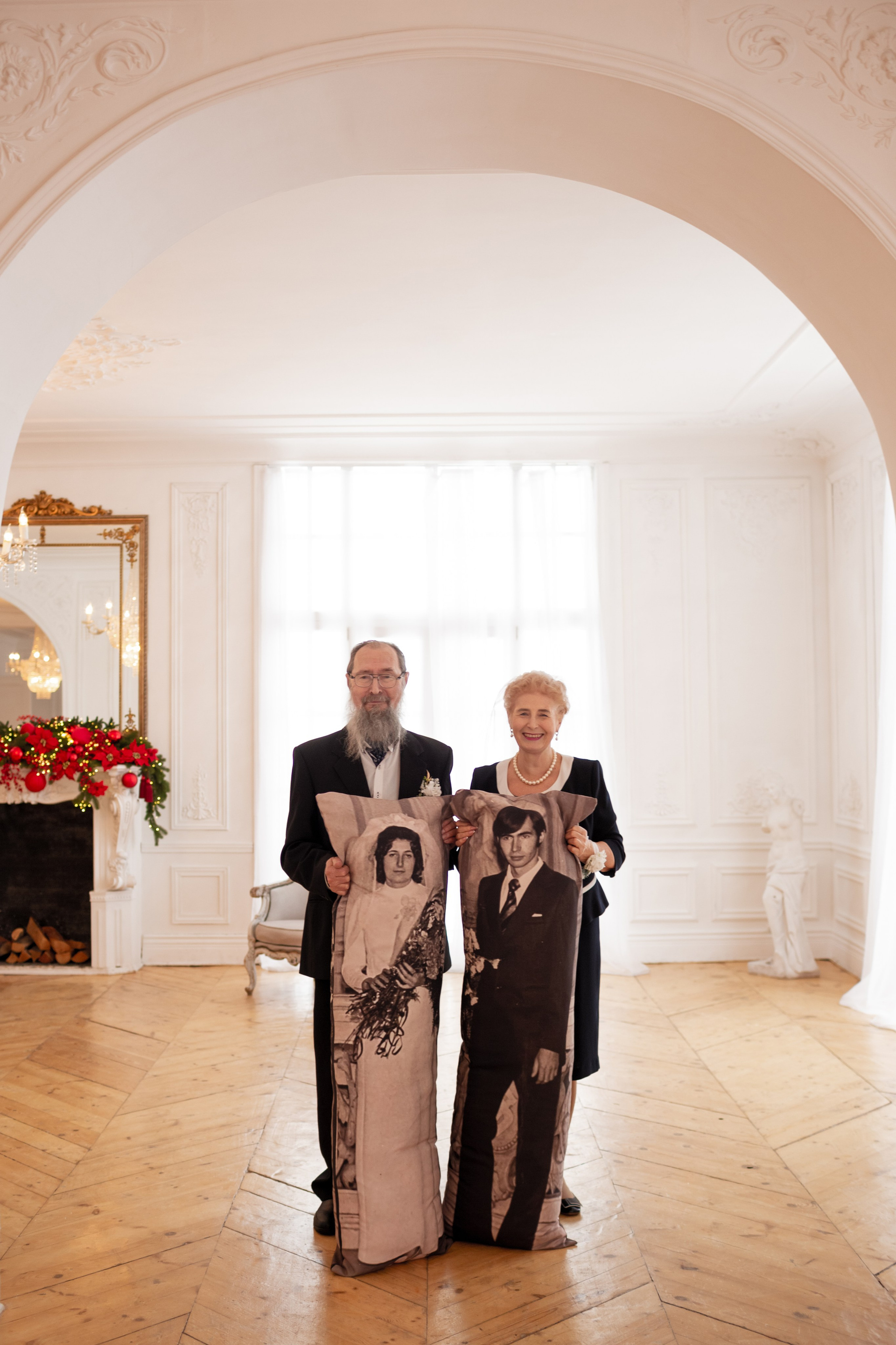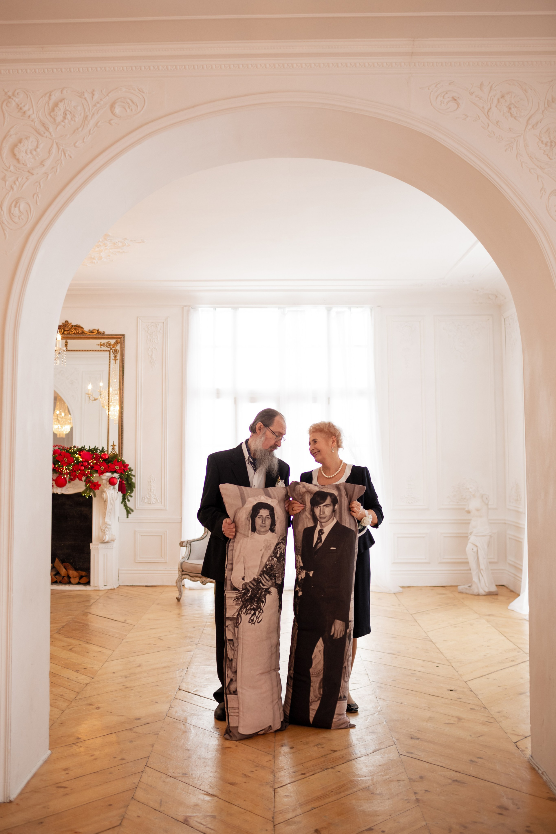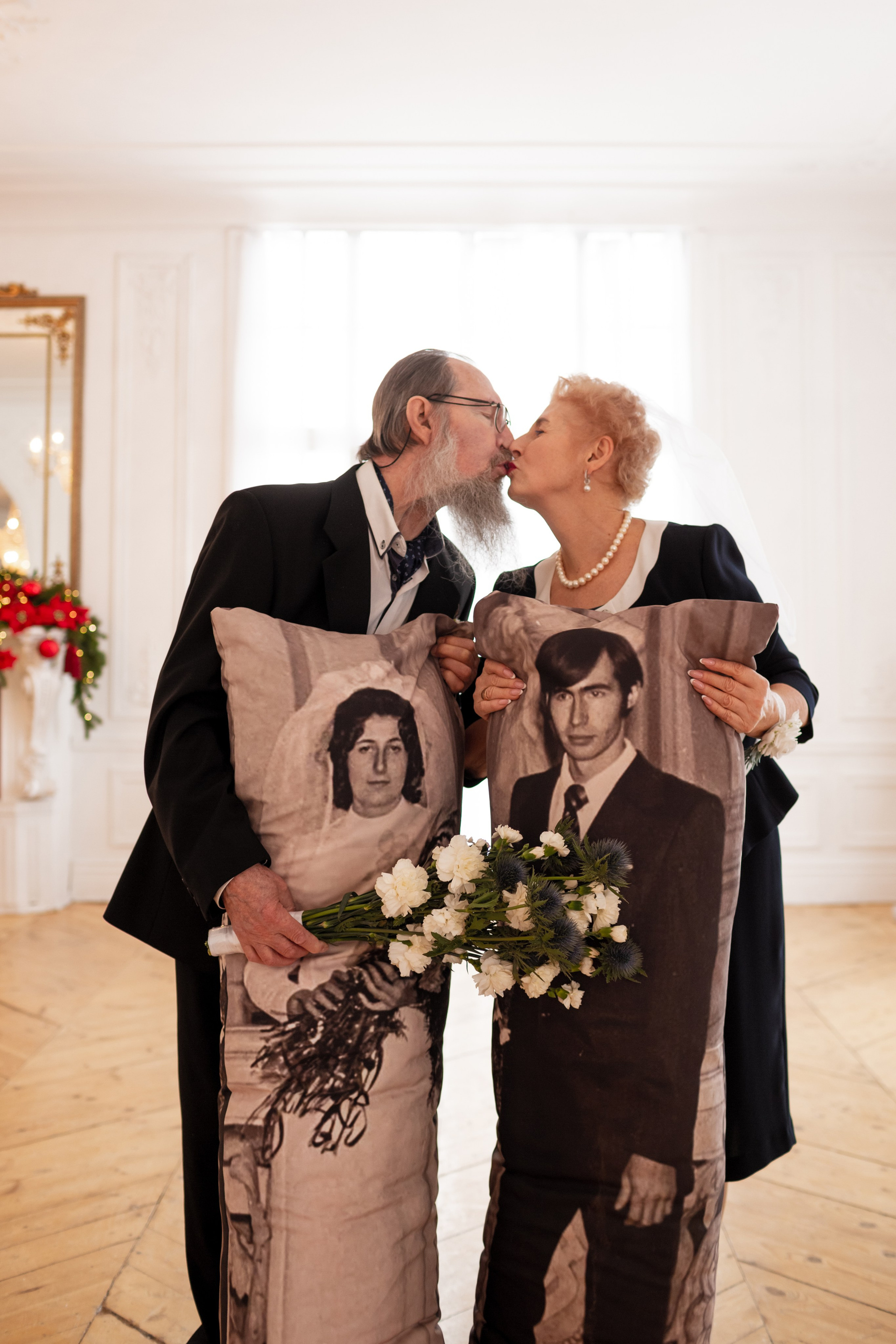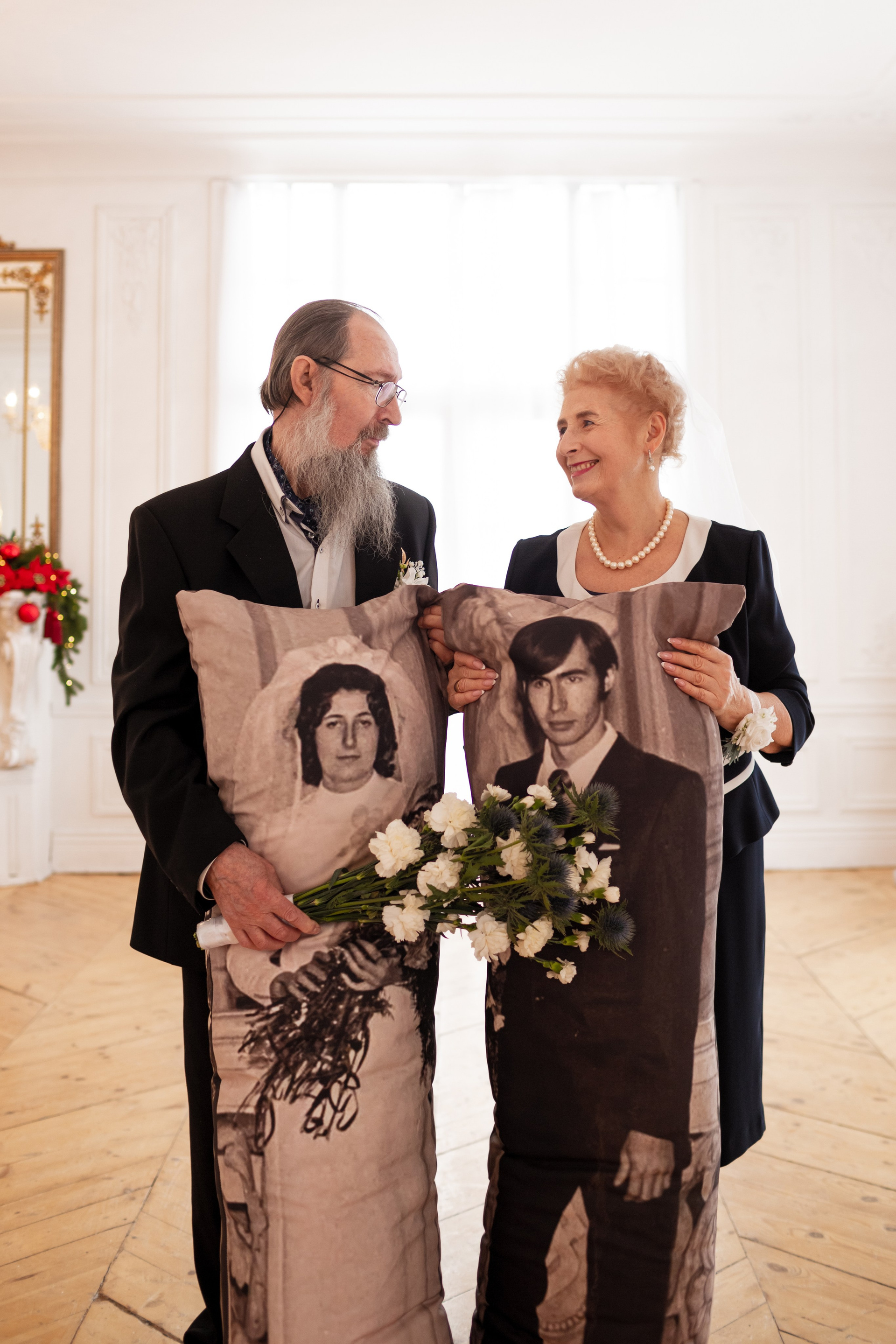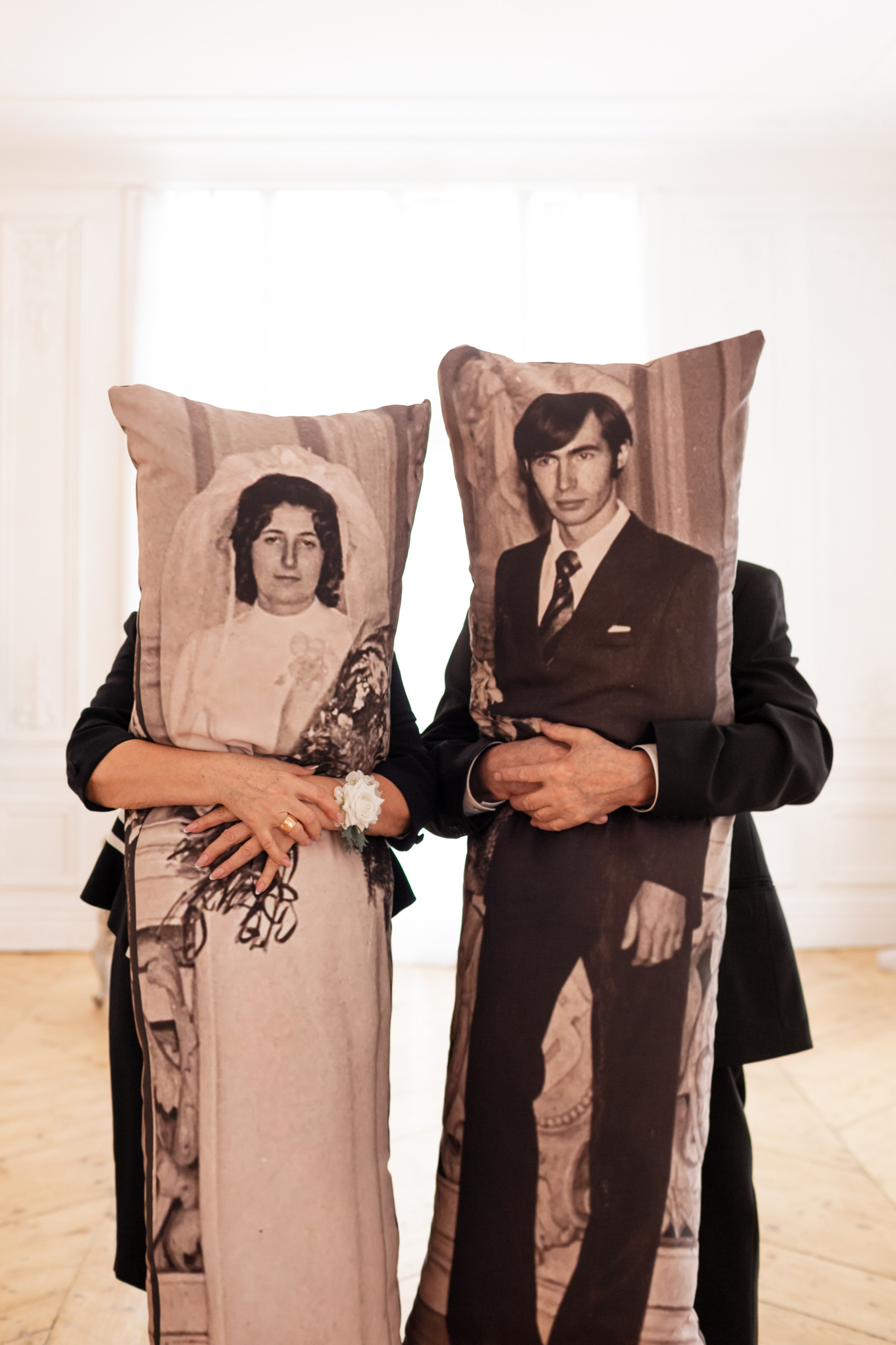 Елена и Владимир выбрали сдержанный строгий образ в одежде, но разбавили его с помощью фаты и бутоньерки! А друзья подарили классные подушки-дакимакуры, на которых отпечатали свадебные фотографии из 1976 года — вот такой временной мост у нас получился на съёмке!