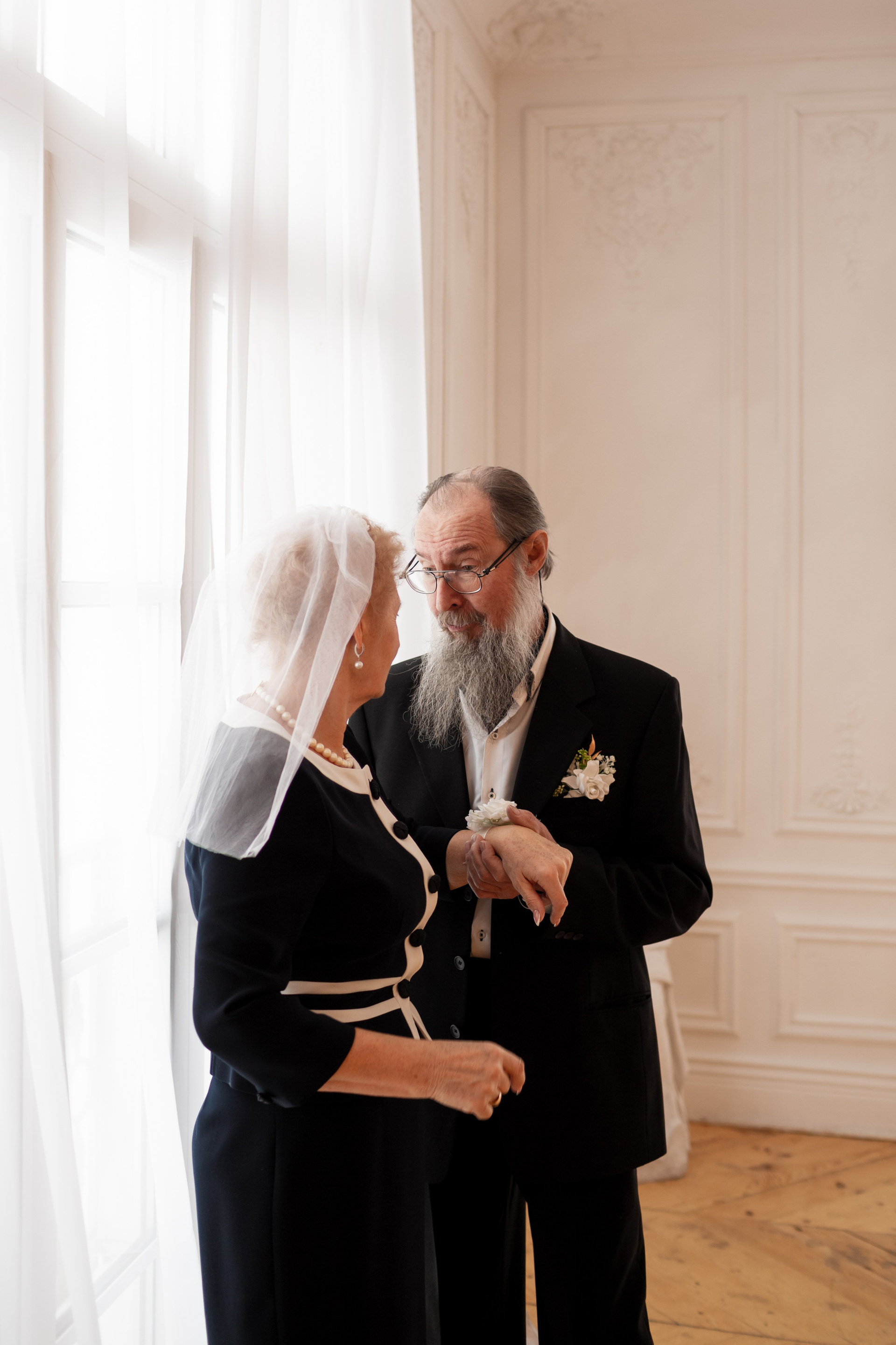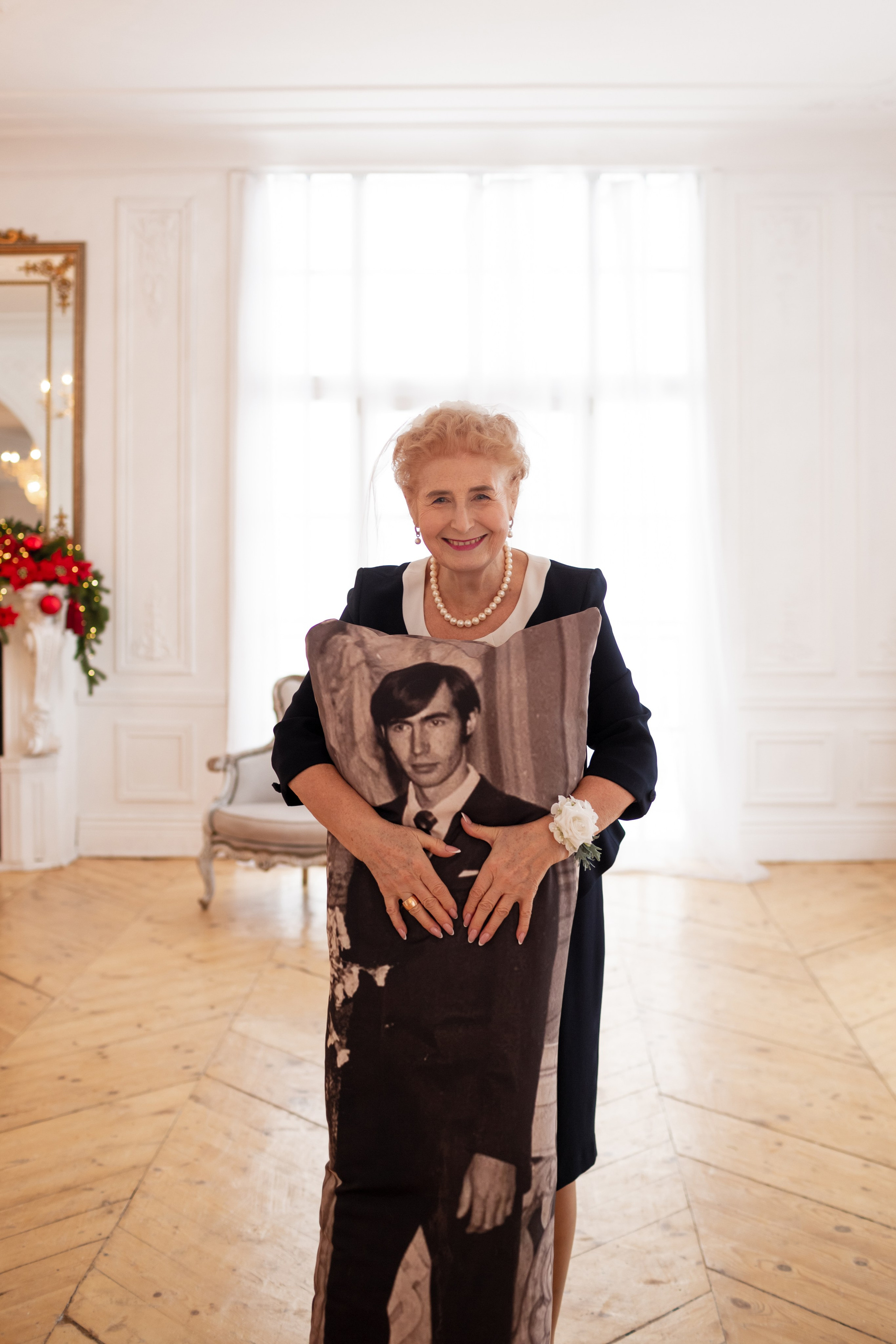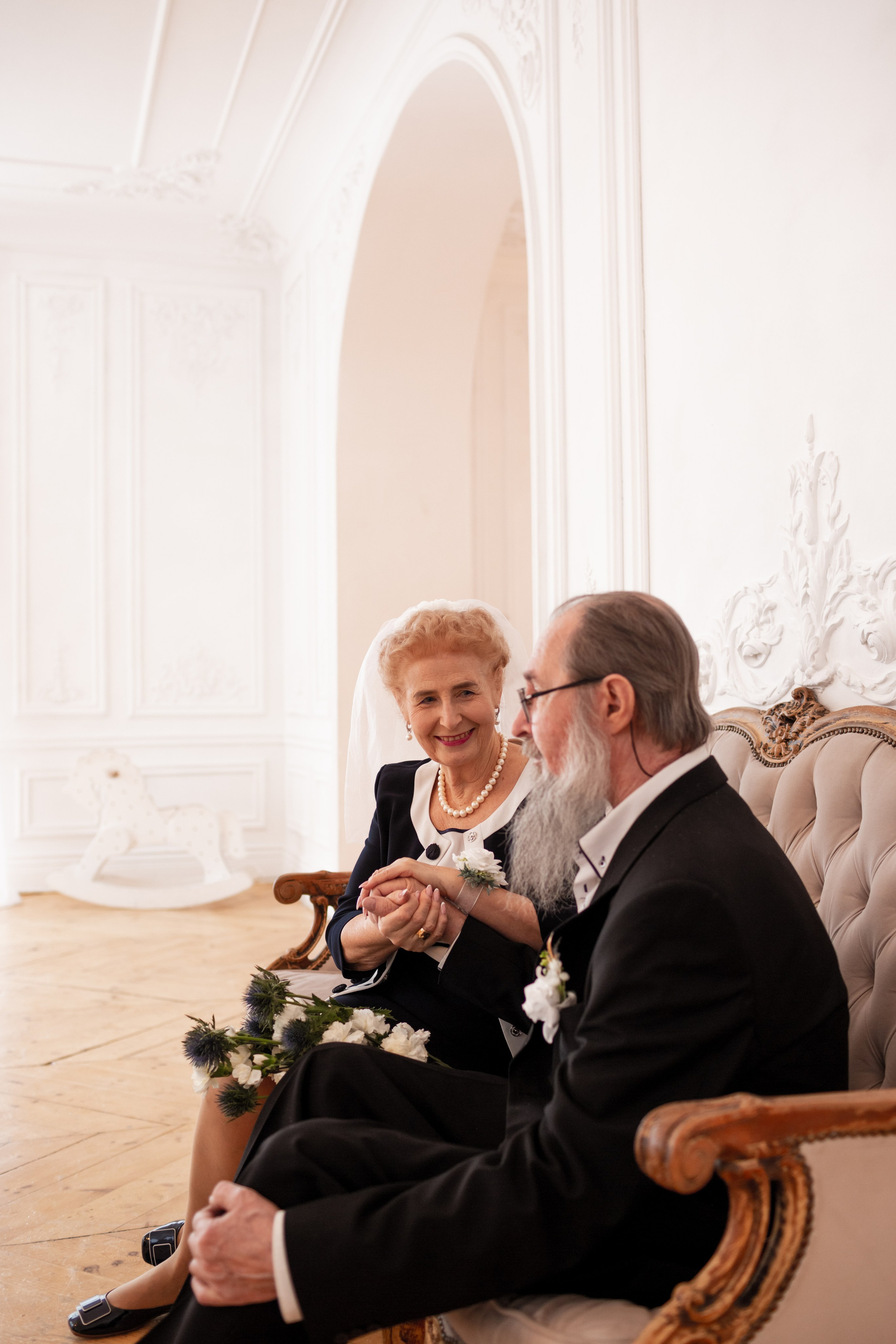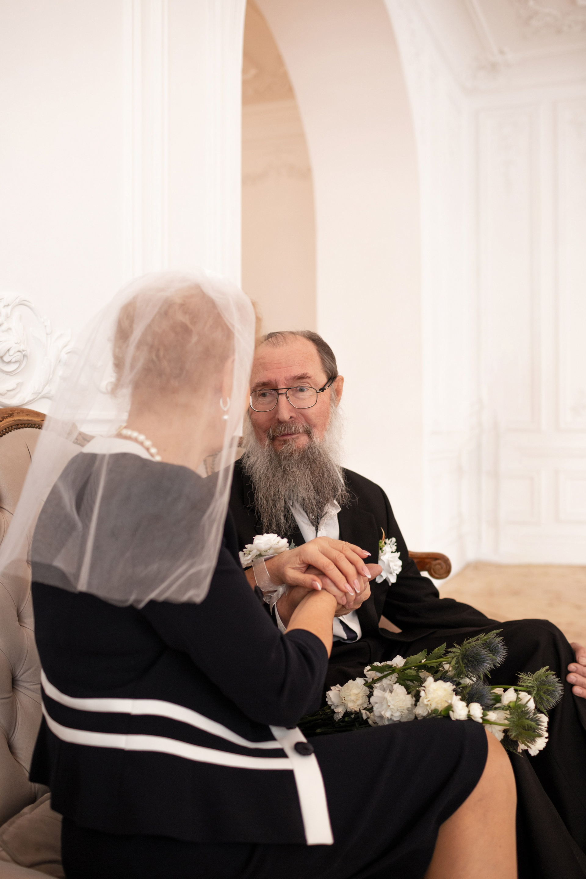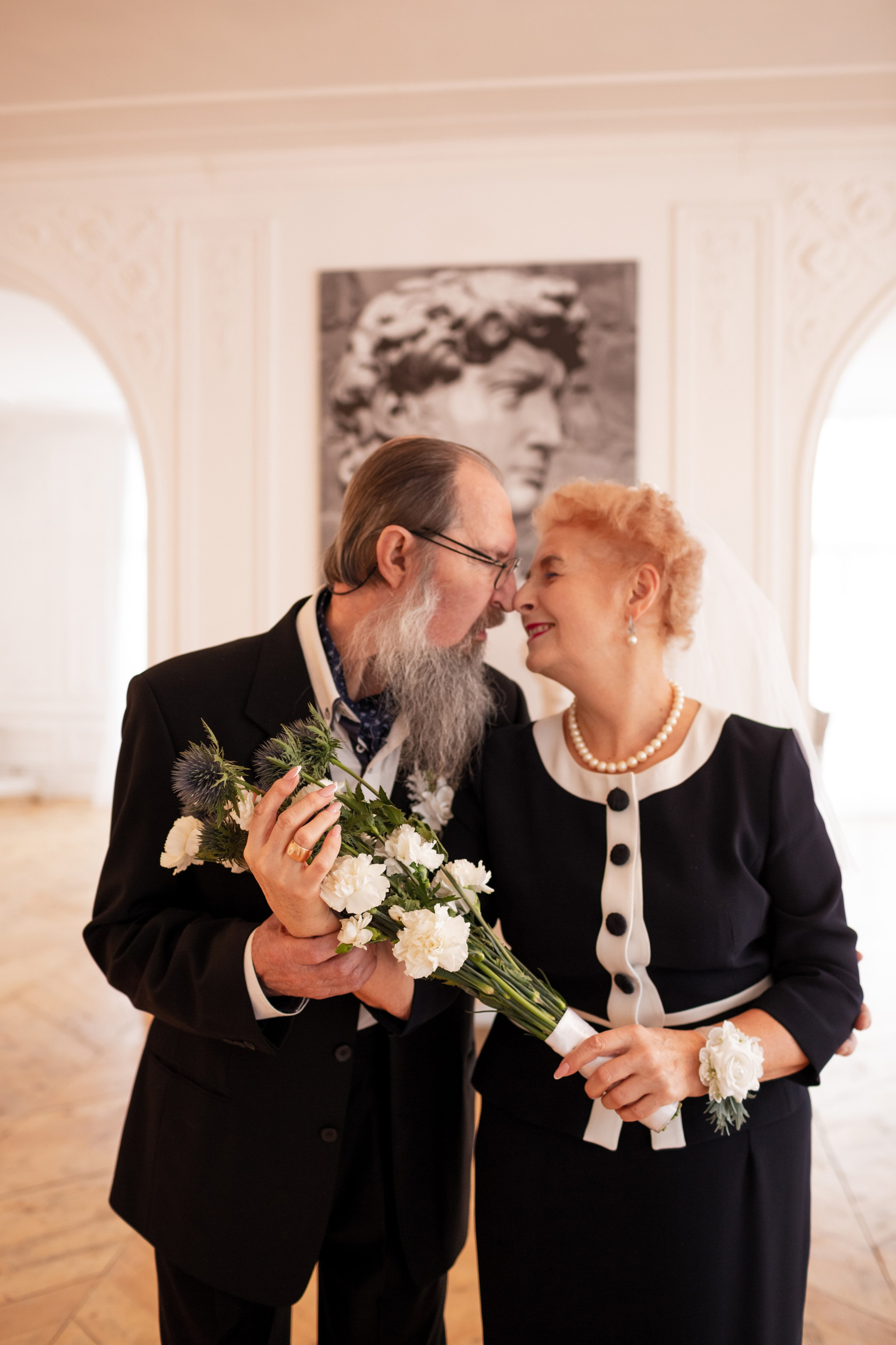 Елена и Владимир выбрали сдержанный строгий образ в одежде, но разбавили его с помощью фаты и бутоньерки! А друзья подарили классные подушки-дакимакуры, на которых отпечатали свадебные фотографии из 1976 года — вот такой временной мост у нас получился на съёмке!