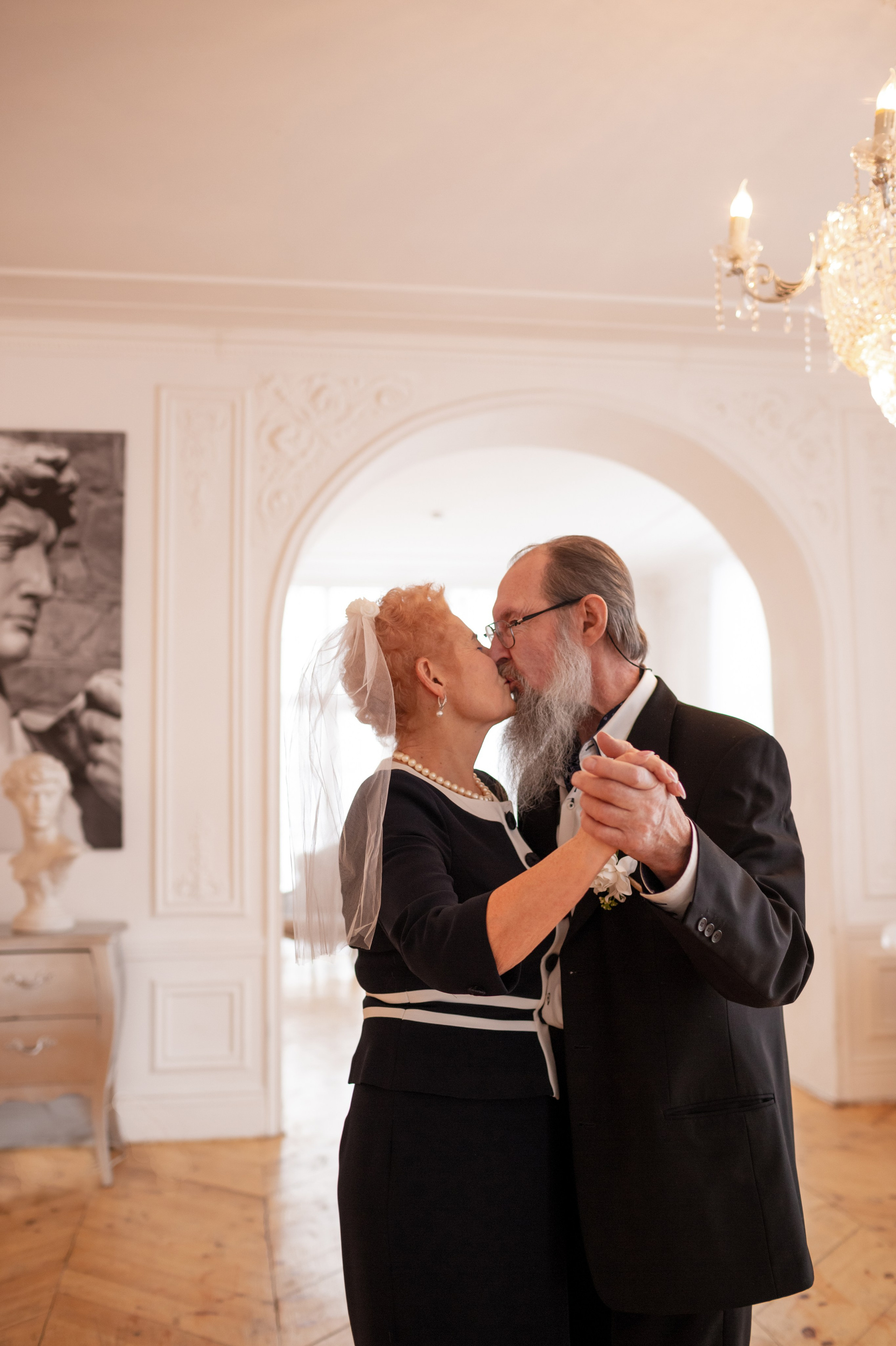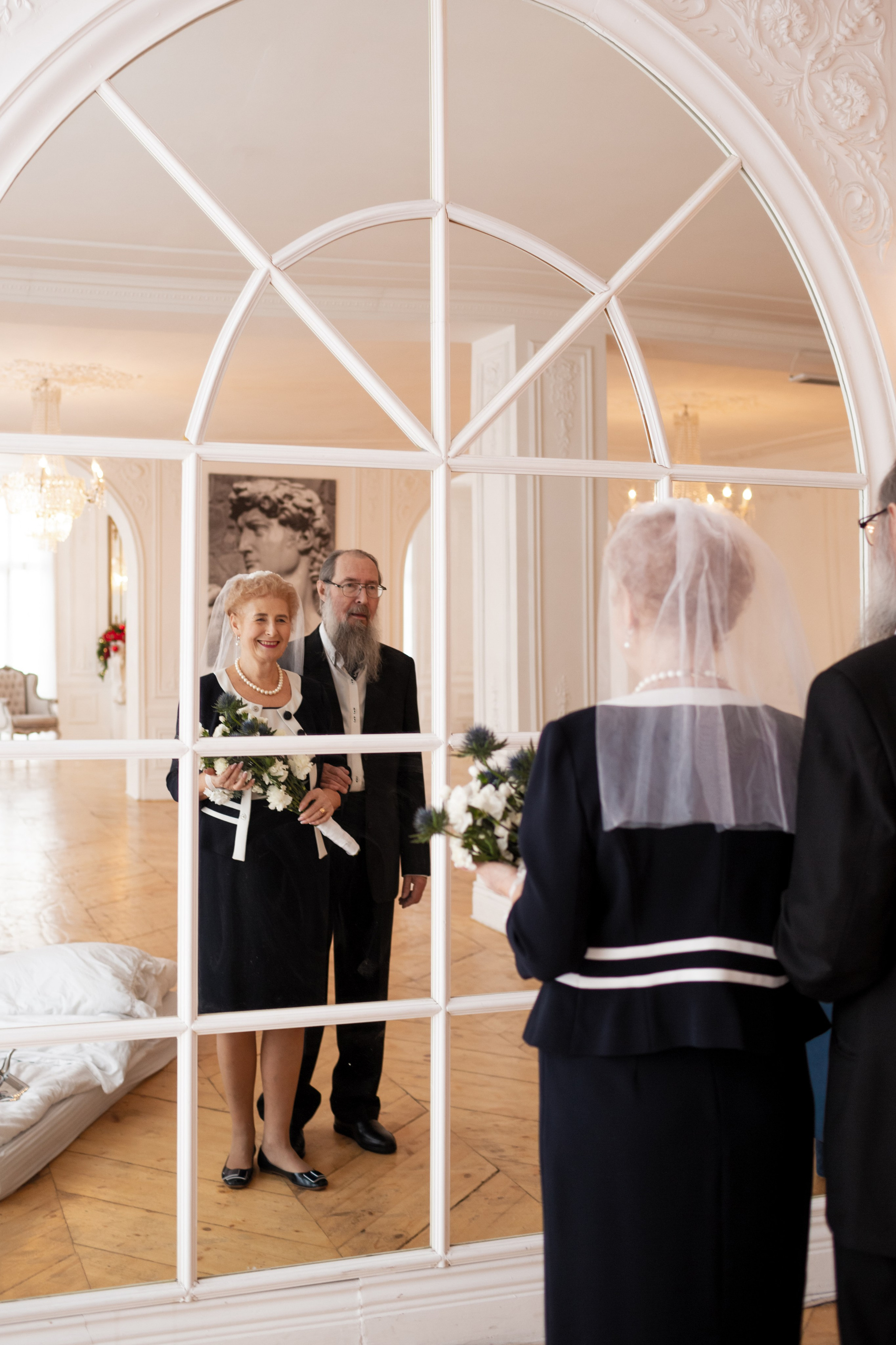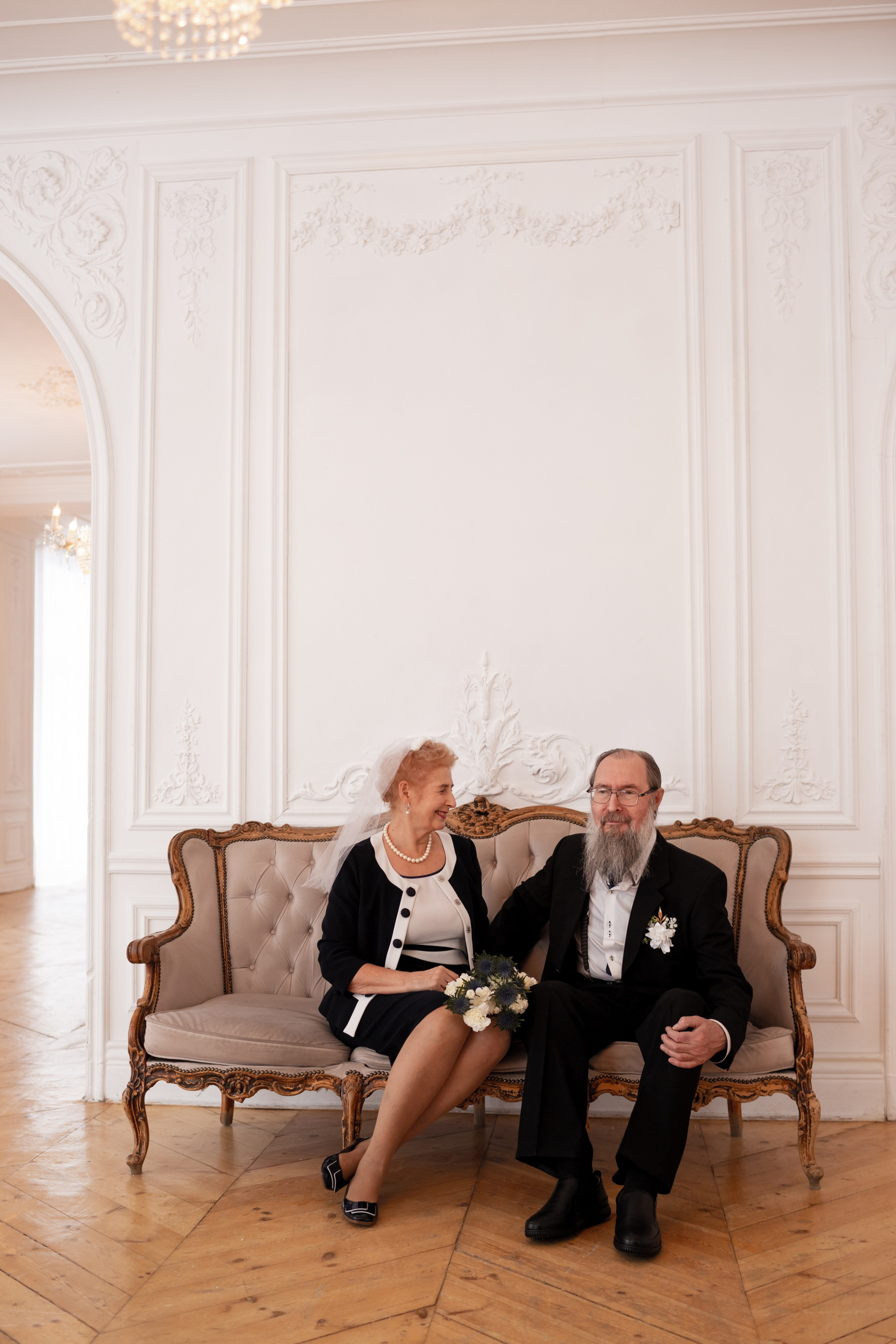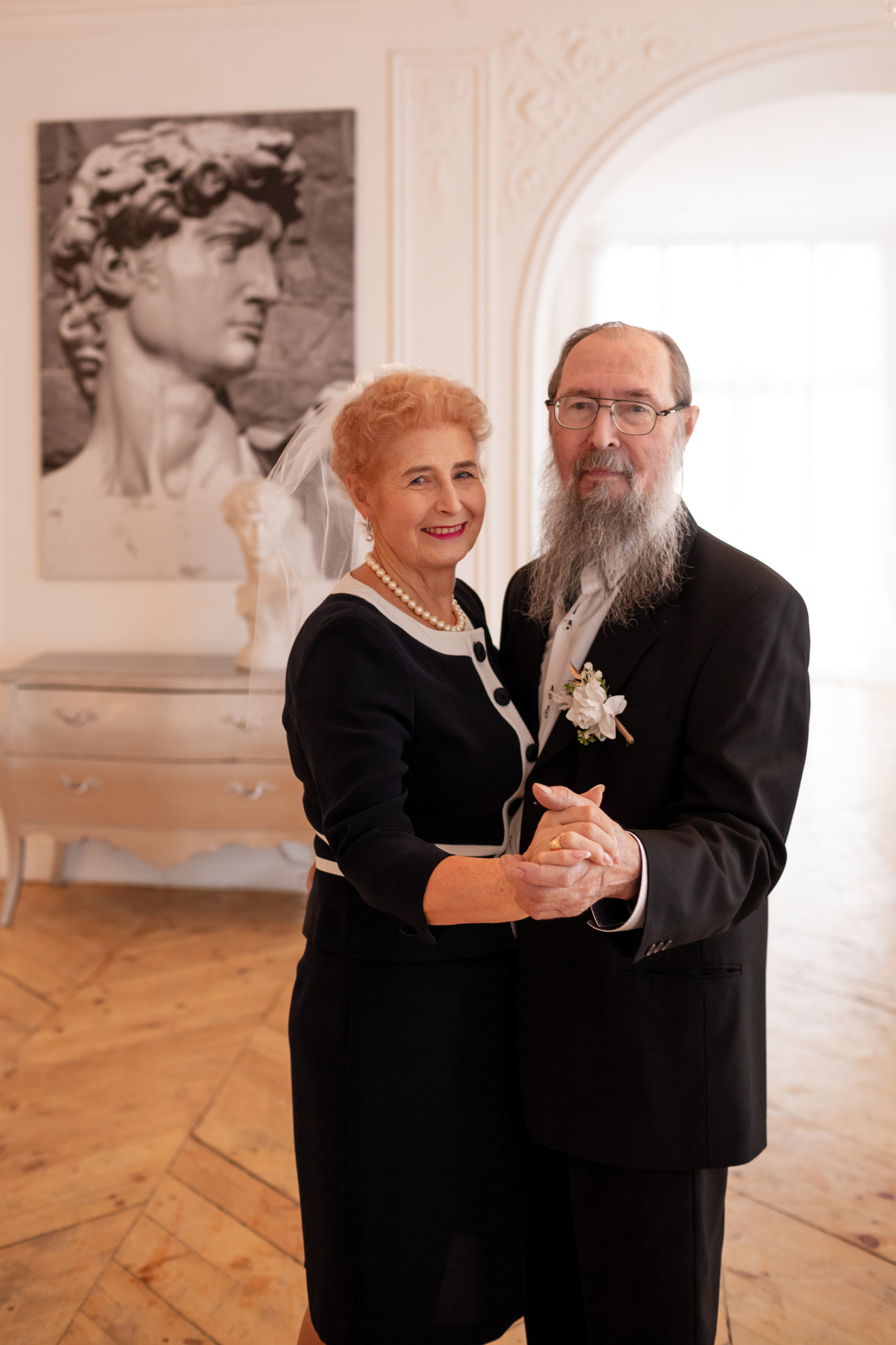 Елена и Владимир выбрали сдержанный строгий образ в одежде, но разбавили его с помощью фаты и бутоньерки! А друзья подарили классные подушки-дакимакуры, на которых отпечатали свадебные фотографии из 1976 года — вот такой временной мост у нас получился на съёмке!