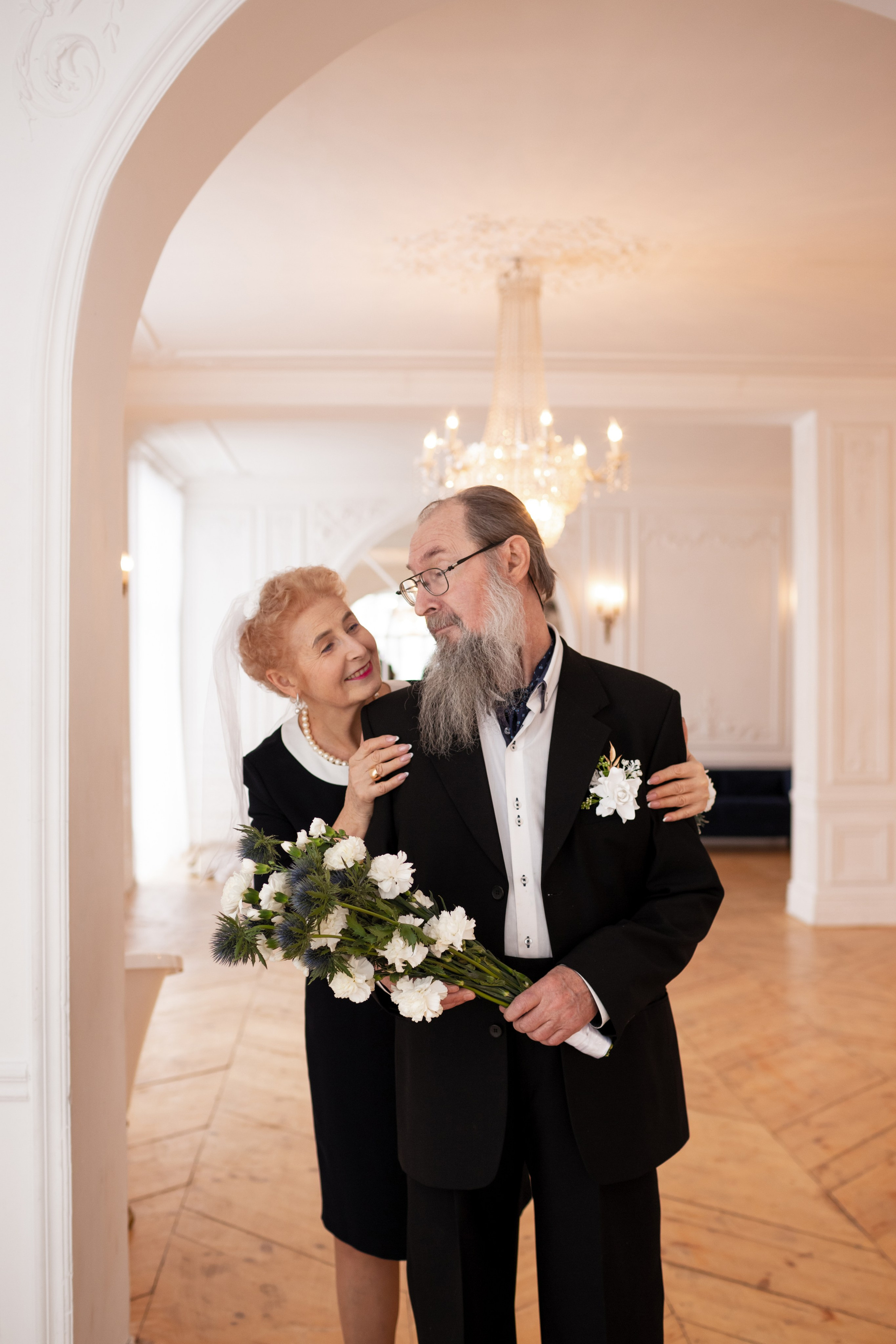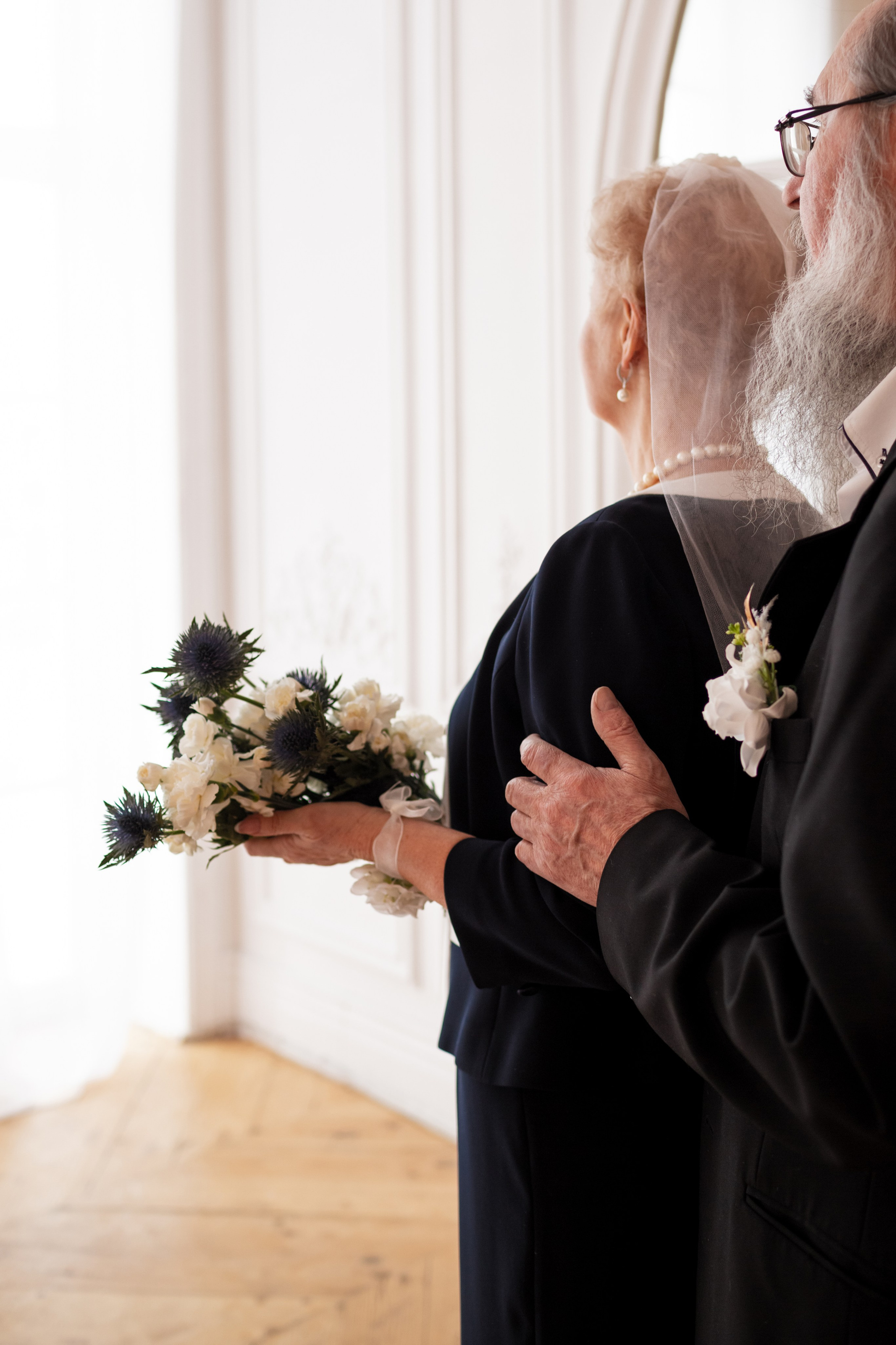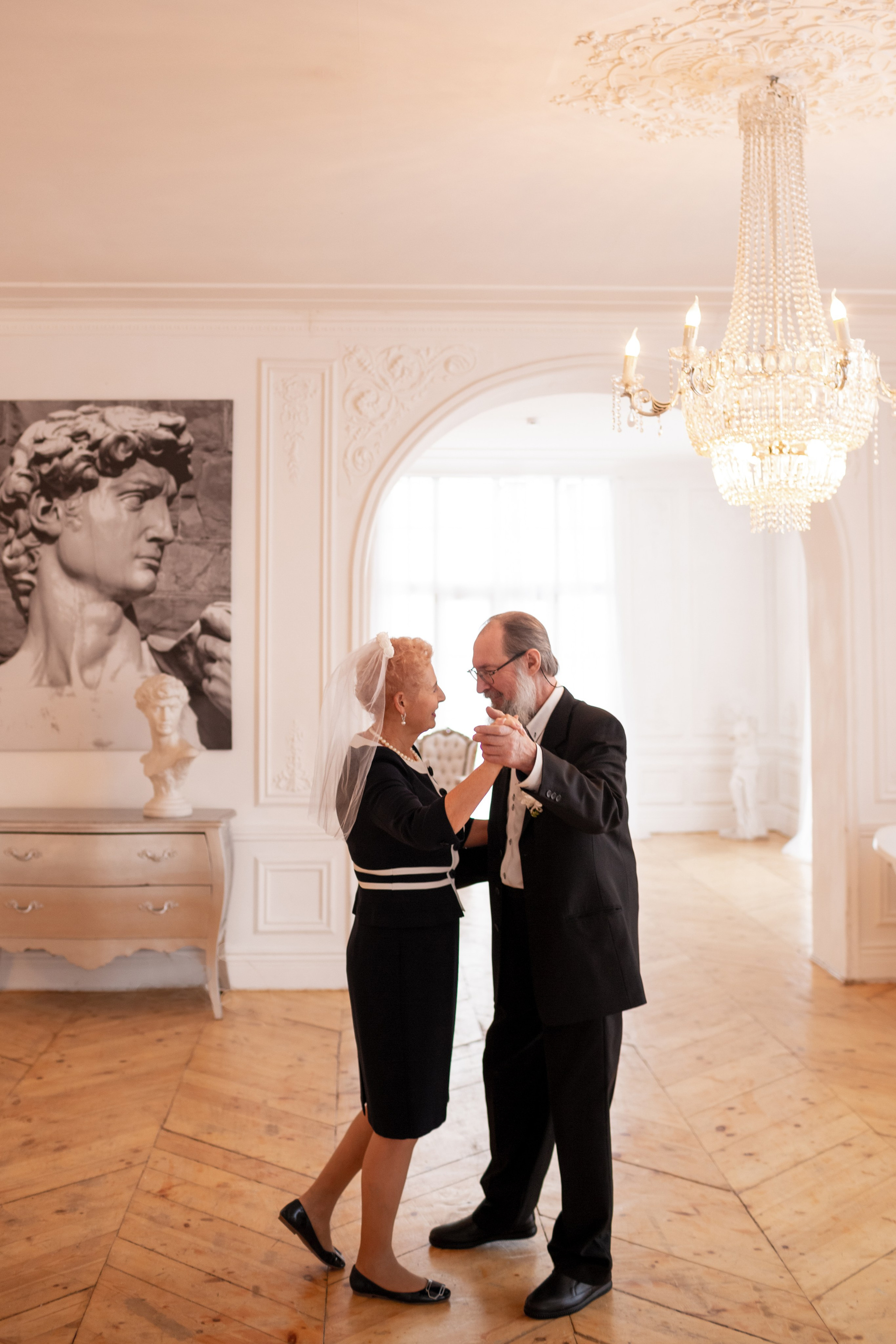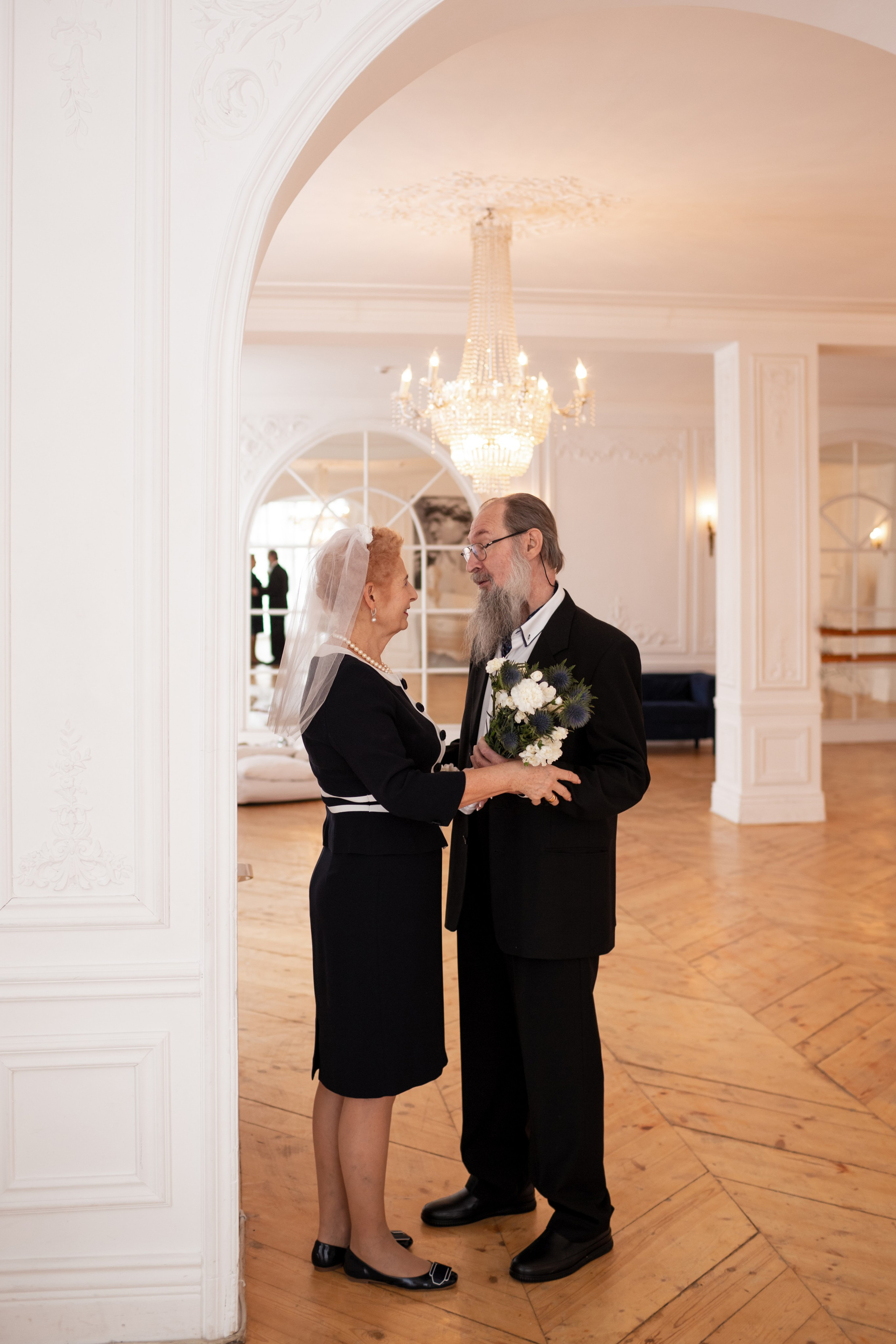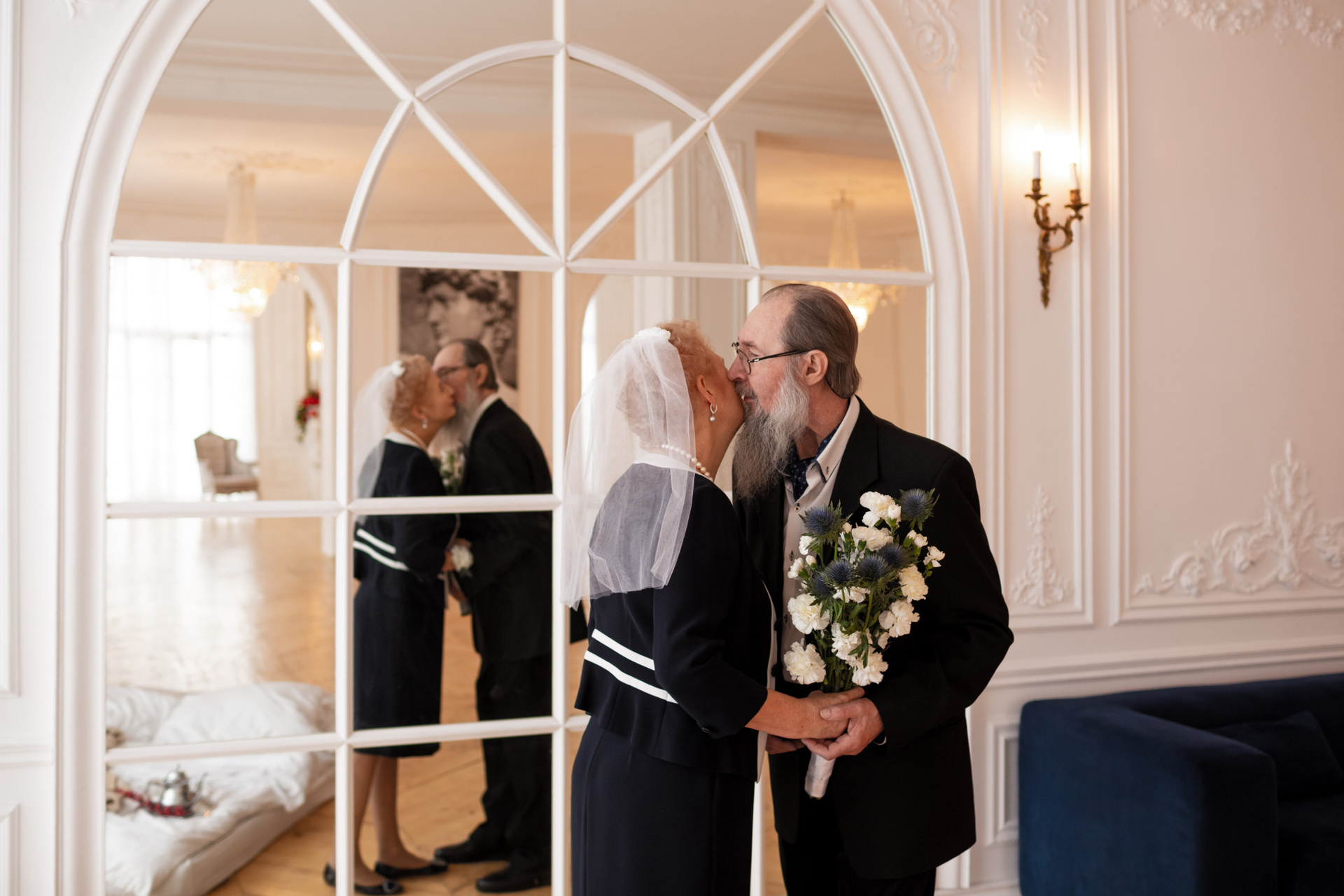 Елена и Владимир выбрали сдержанный строгий образ в одежде, но разбавили его с помощью фаты и бутоньерки! А друзья подарили классные подушки-дакимакуры, на которых отпечатали свадебные фотографии из 1976 года — вот такой временной мост у нас получился на съёмке!