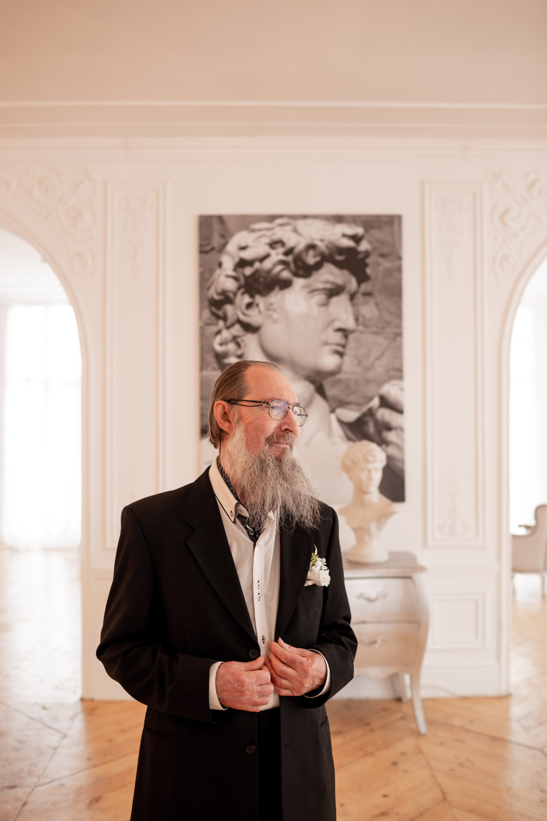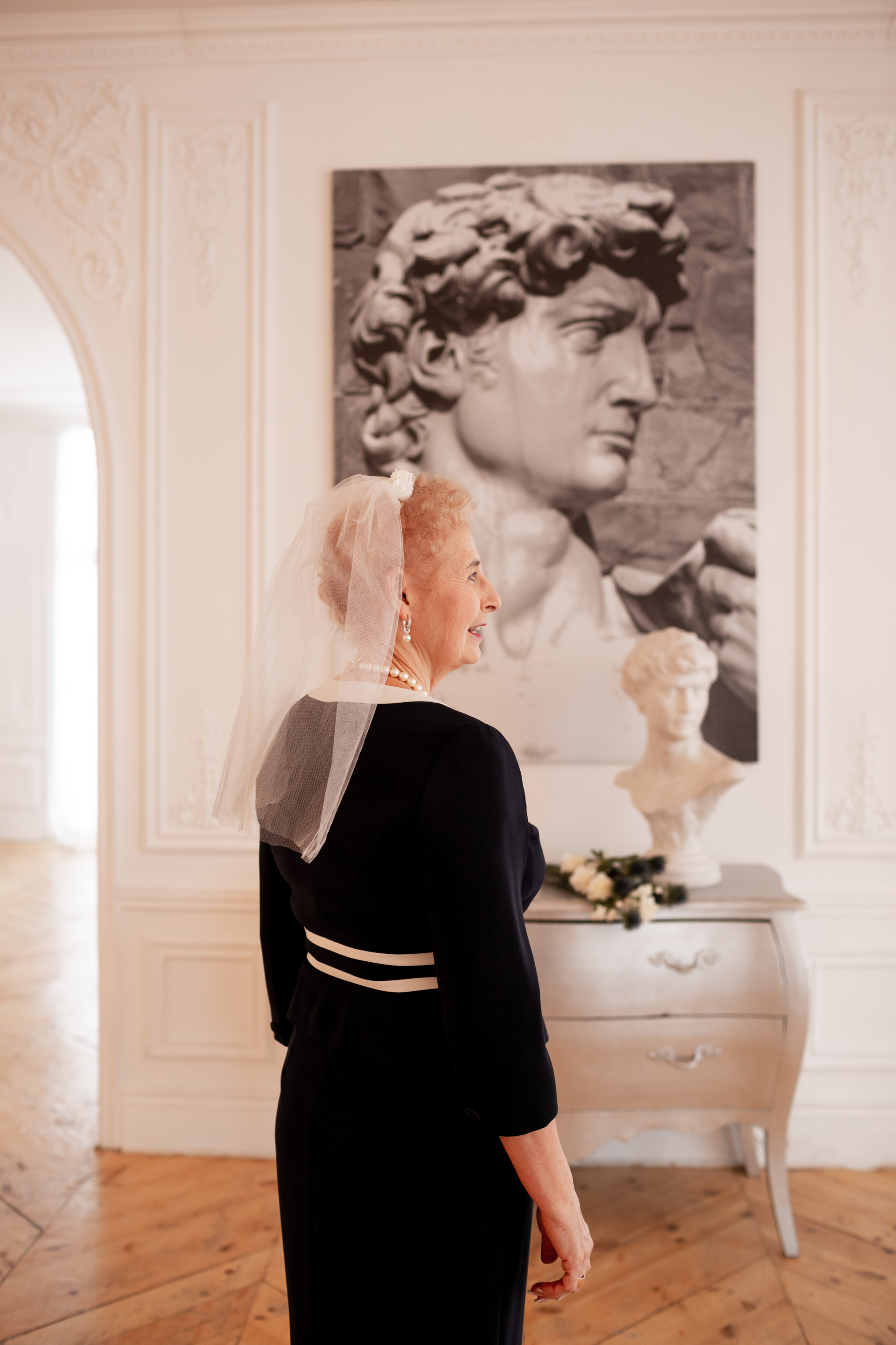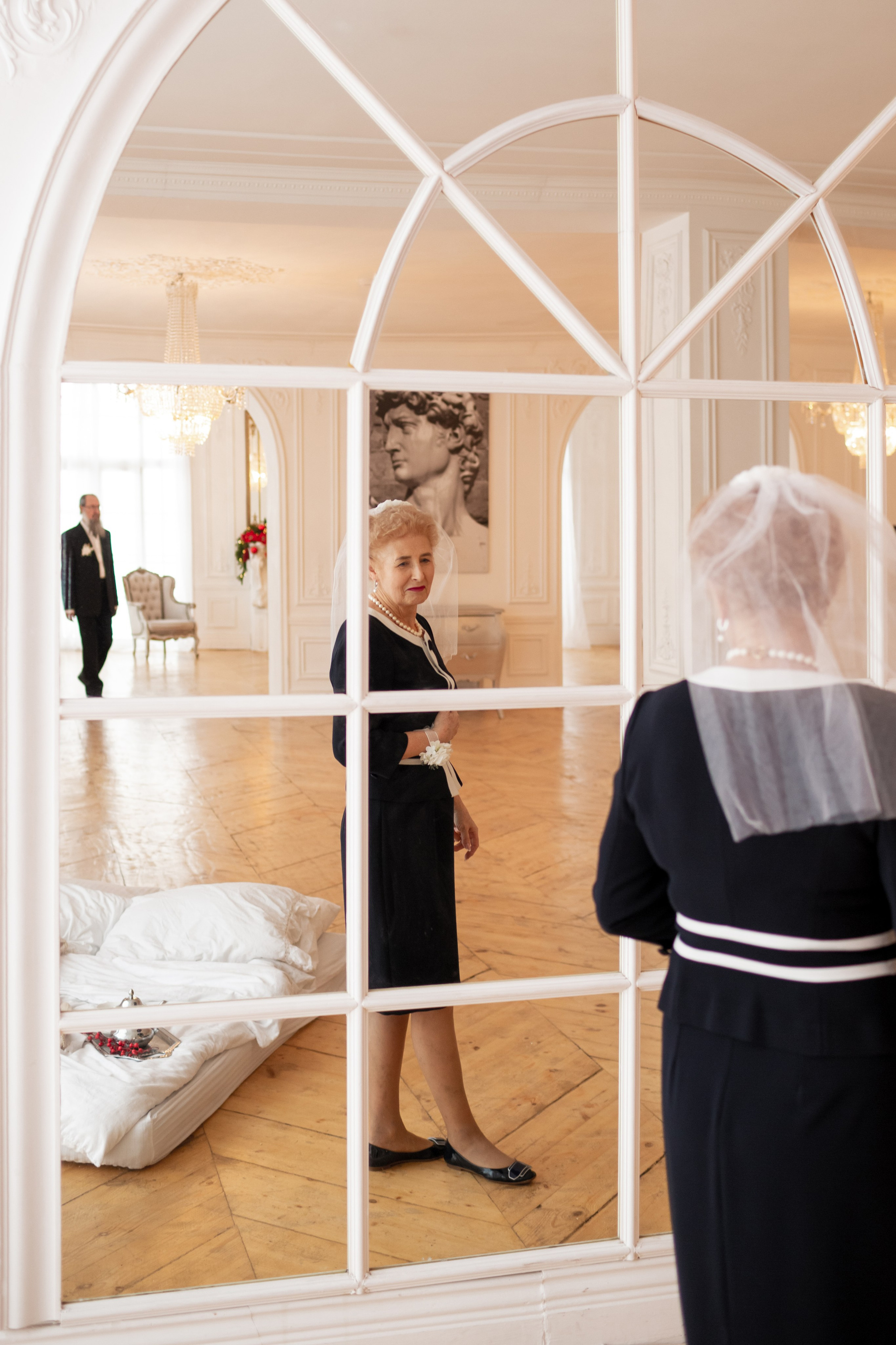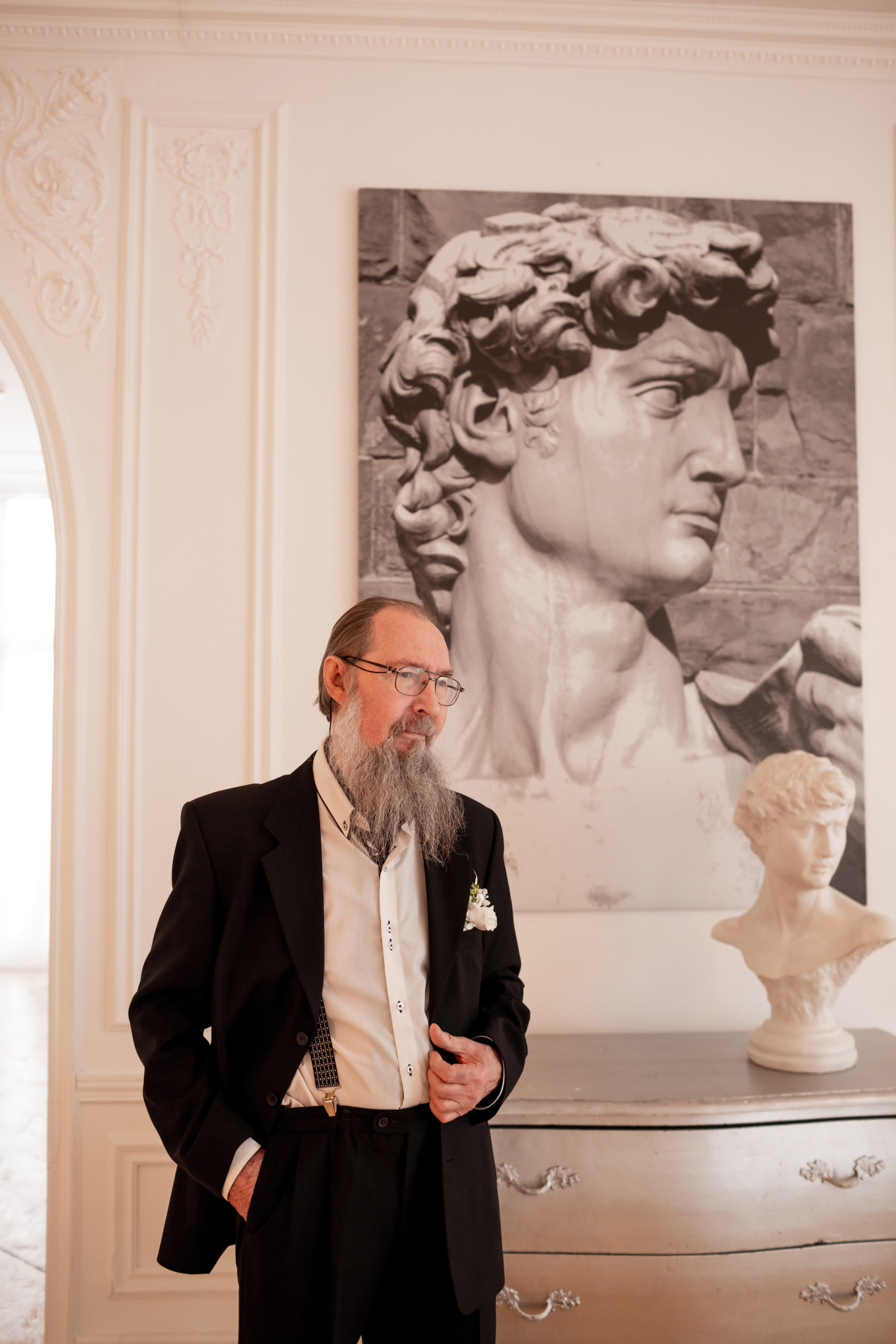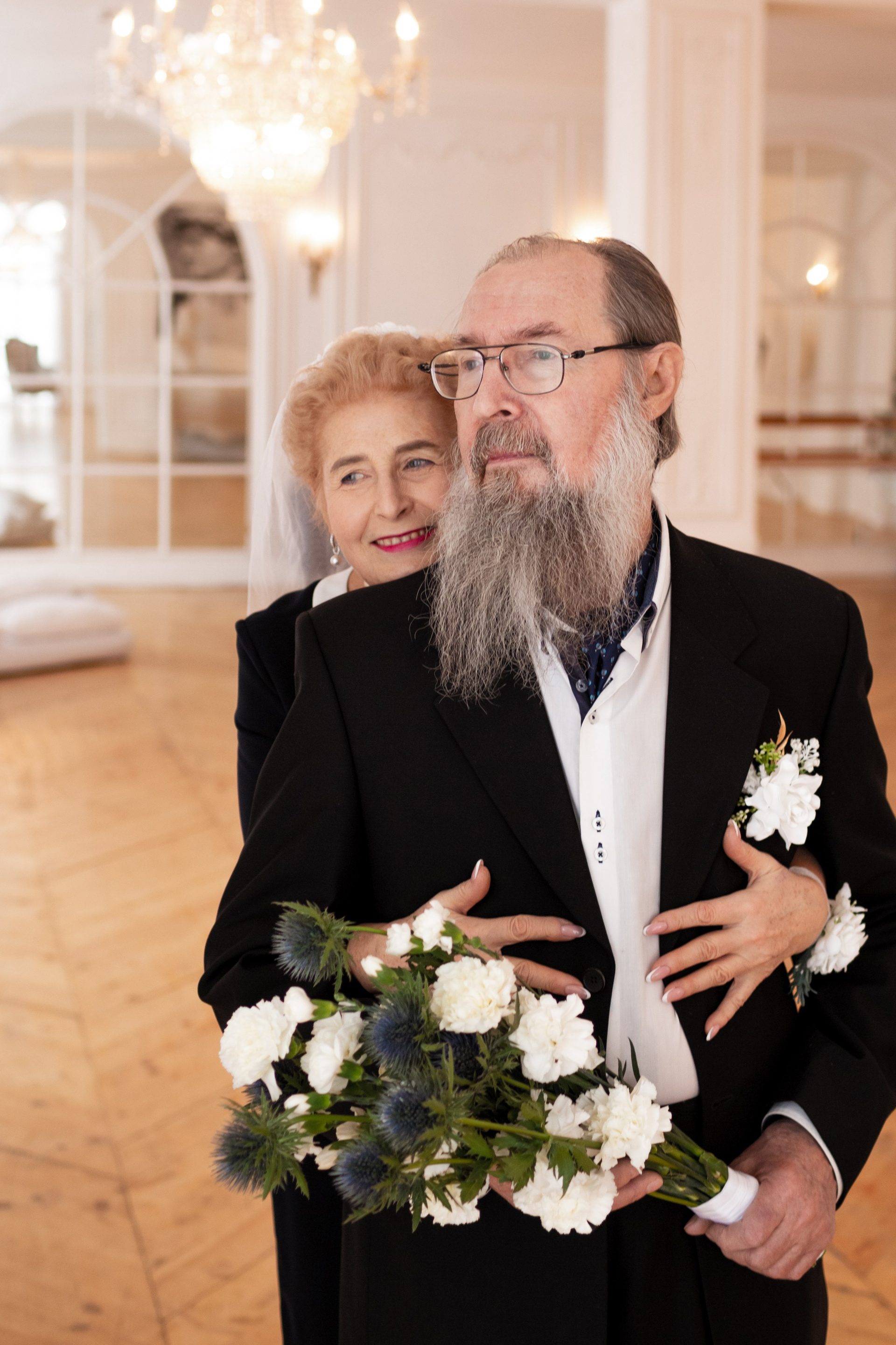 Елена и Владимир выбрали сдержанный строгий образ в одежде, но разбавили его с помощью фаты и бутоньерки! А друзья подарили классные подушки-дакимакуры, на которых отпечатали свадебные фотографии из 1976 года — вот такой временной мост у нас получился на съёмке!