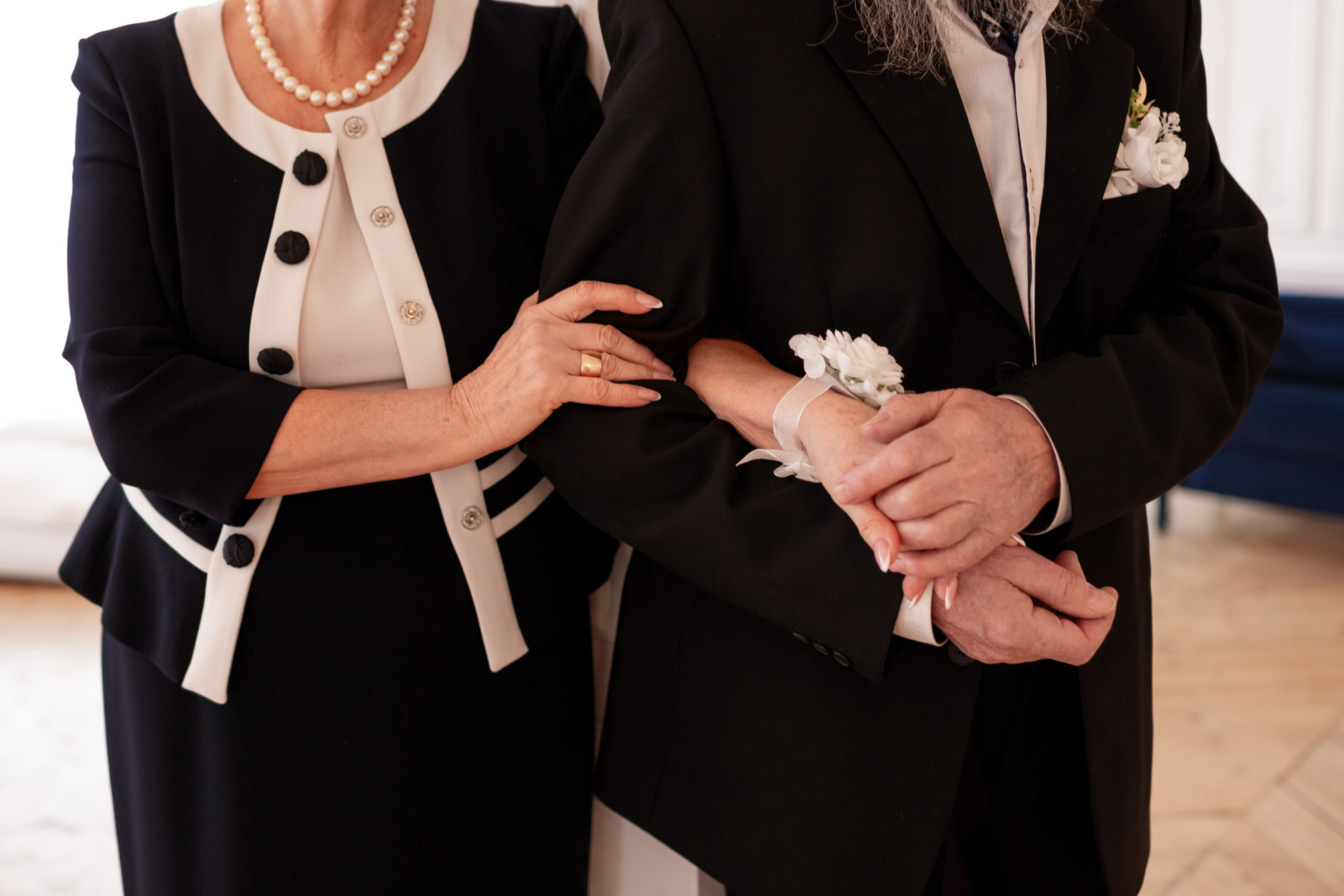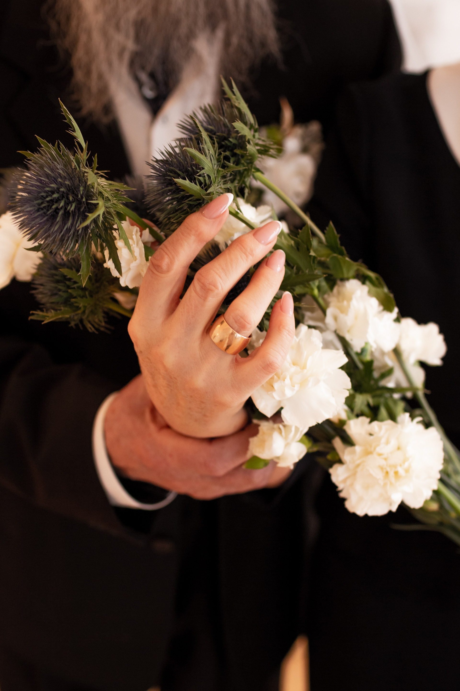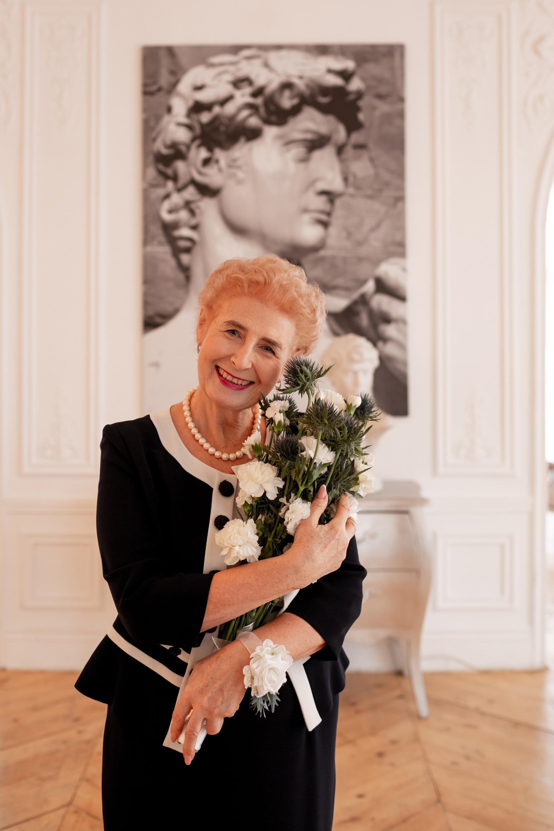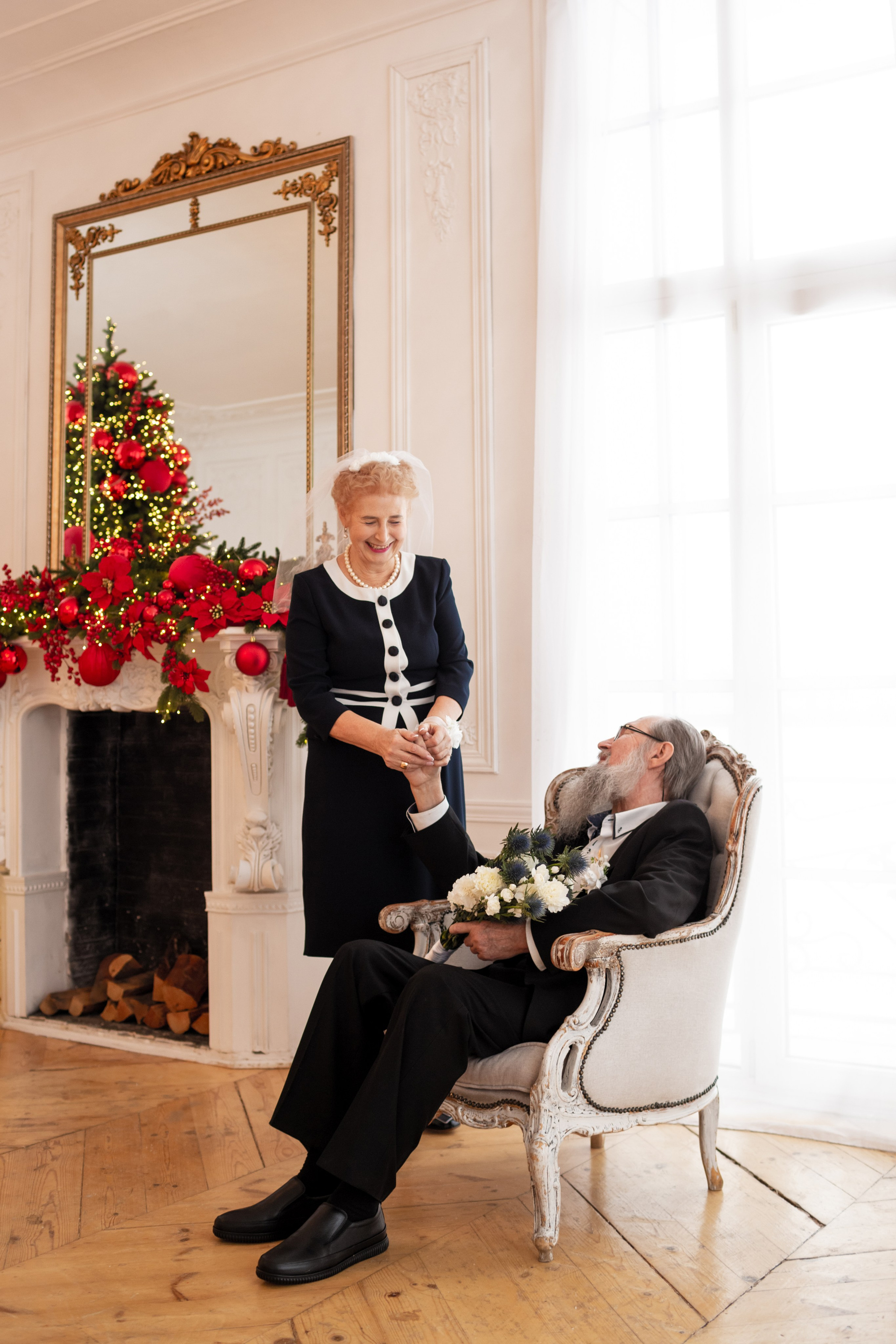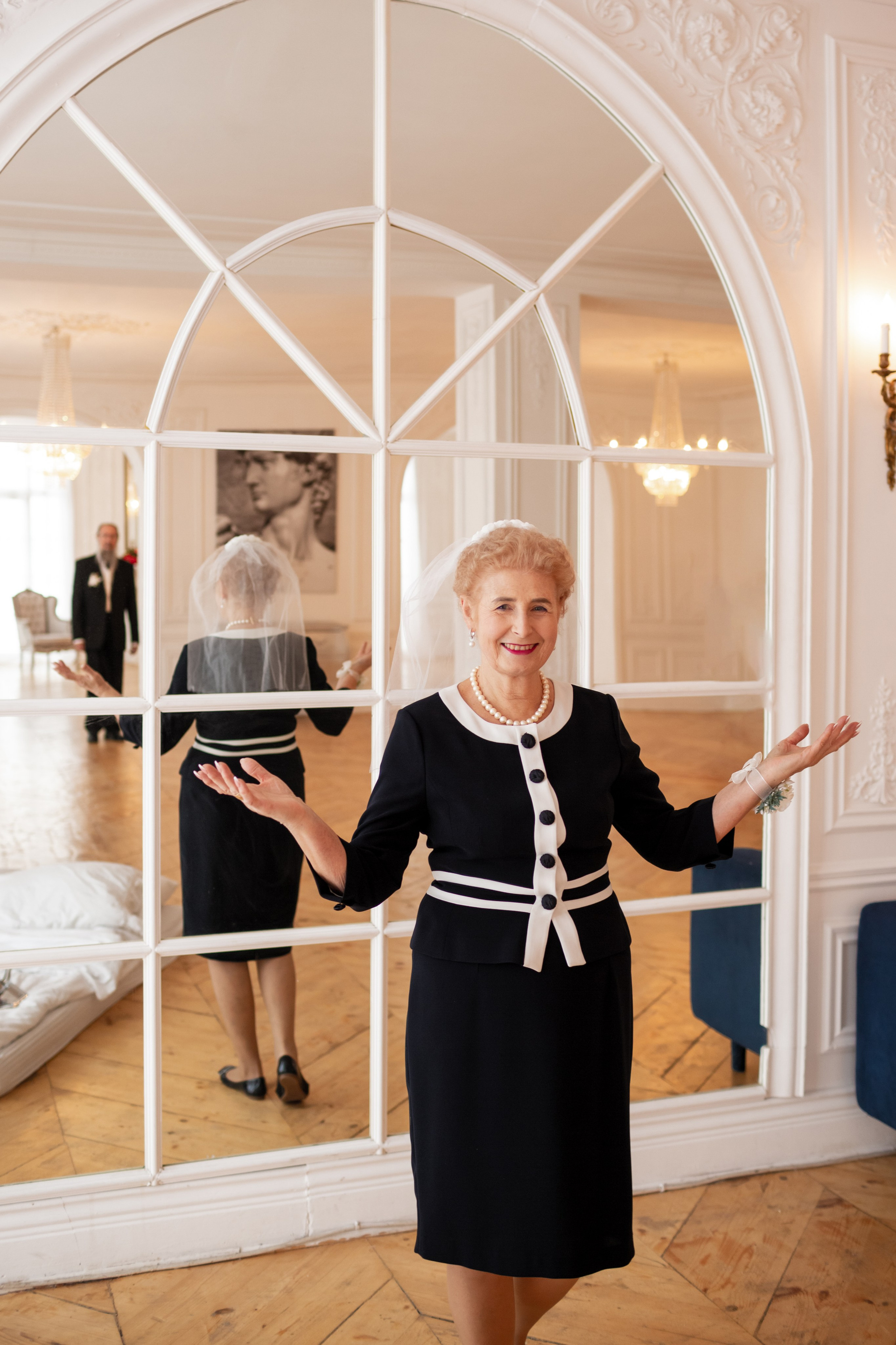 Елена и Владимир выбрали сдержанный строгий образ в одежде, но разбавили его с помощью фаты и бутоньерки! А друзья подарили классные подушки-дакимакуры, на которых отпечатали свадебные фотографии из 1976 года — вот такой временной мост у нас получился на съёмке!